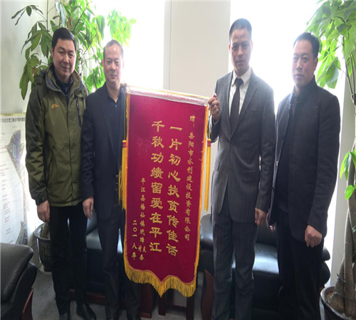 1月22日,平江縣梅仙鎮(zhèn)玳璋村幫扶對(duì)象,將一面寫著"一片初心扶貧傳佳話,千秋功績(jī)留愛在平江"18個(gè)大字的鮮紅錦旗送到市水建投董事長(zhǎng)劉寶山、總經(jīng)理?xiàng)钚圯x的手中,對(duì)市水建投對(duì)精準(zhǔn)扶貧工作的大力支持表達(dá)誠摯謝意。